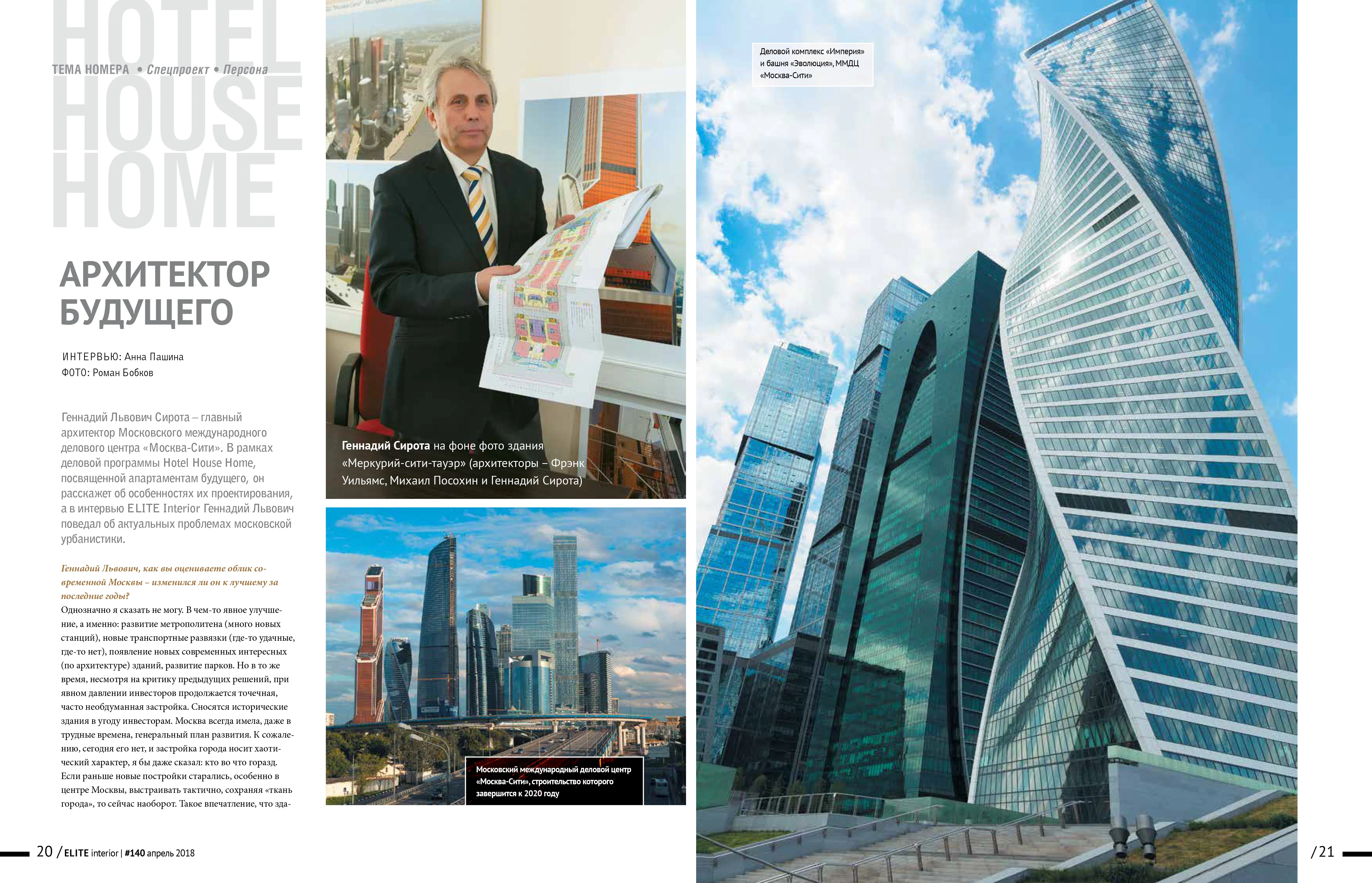 The article, published in ELITE Interior magazine, offers readers an intimate look into Sirota’s design philosophy, his approach to large-scale urban projects, and his vision for the future of hospitality and residential design. Through detailed interviews and project showcases, the report explores how his work bridges international architectural trends with Russian cultural context.