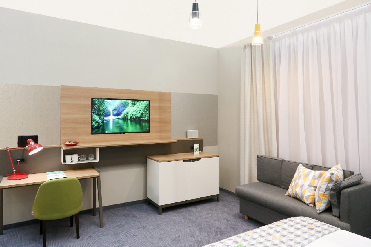 As part of the HOTEL HOUSE HOME forum, the exhibition “Focusing on Hotel” introduced ARCH Moscow visitors to mock-ups of standard hotel rooms, including one created for “Holiday Inn” as part of the renovation of the “HI Sokolniki” hotel. These models reflect the latest standards for designing 3-star and 5-star hotels.